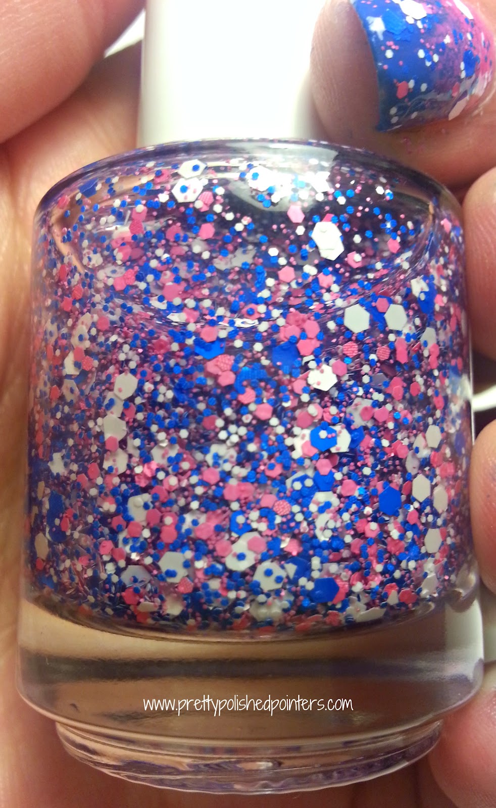 Here's a close up bottle shot of "Mr. Bubble." You can see all the different sizes of pink, blue, and white matte hex glitter.