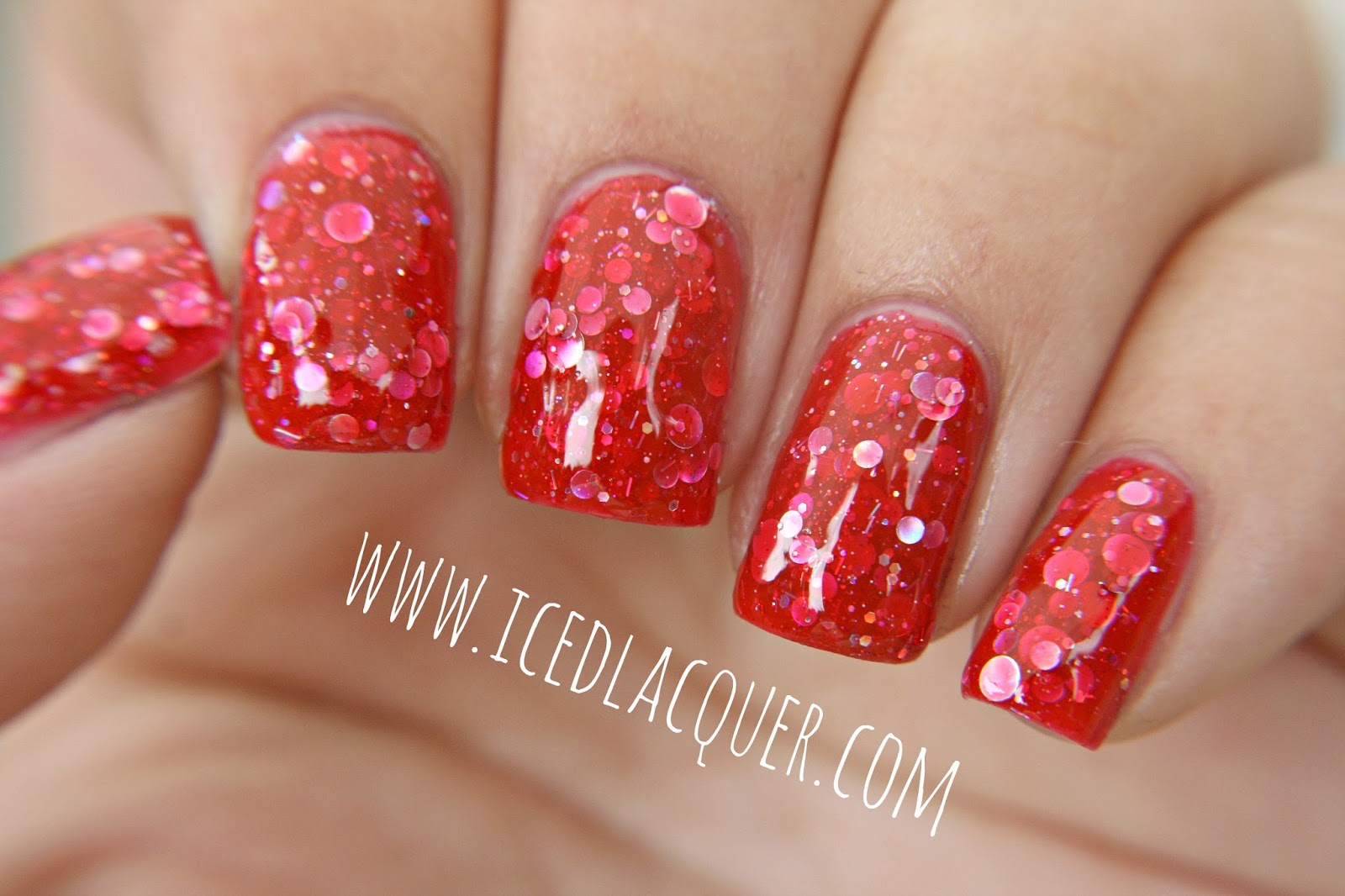 "Vicious Circles" - Bright red jelly base, several sizes of silver holographic circles, and super small silver bar glitters. I used 3 coats, but it could be opaque with two thicker coats! Love love love! You know how much I love my giant, holographic circle glitters!